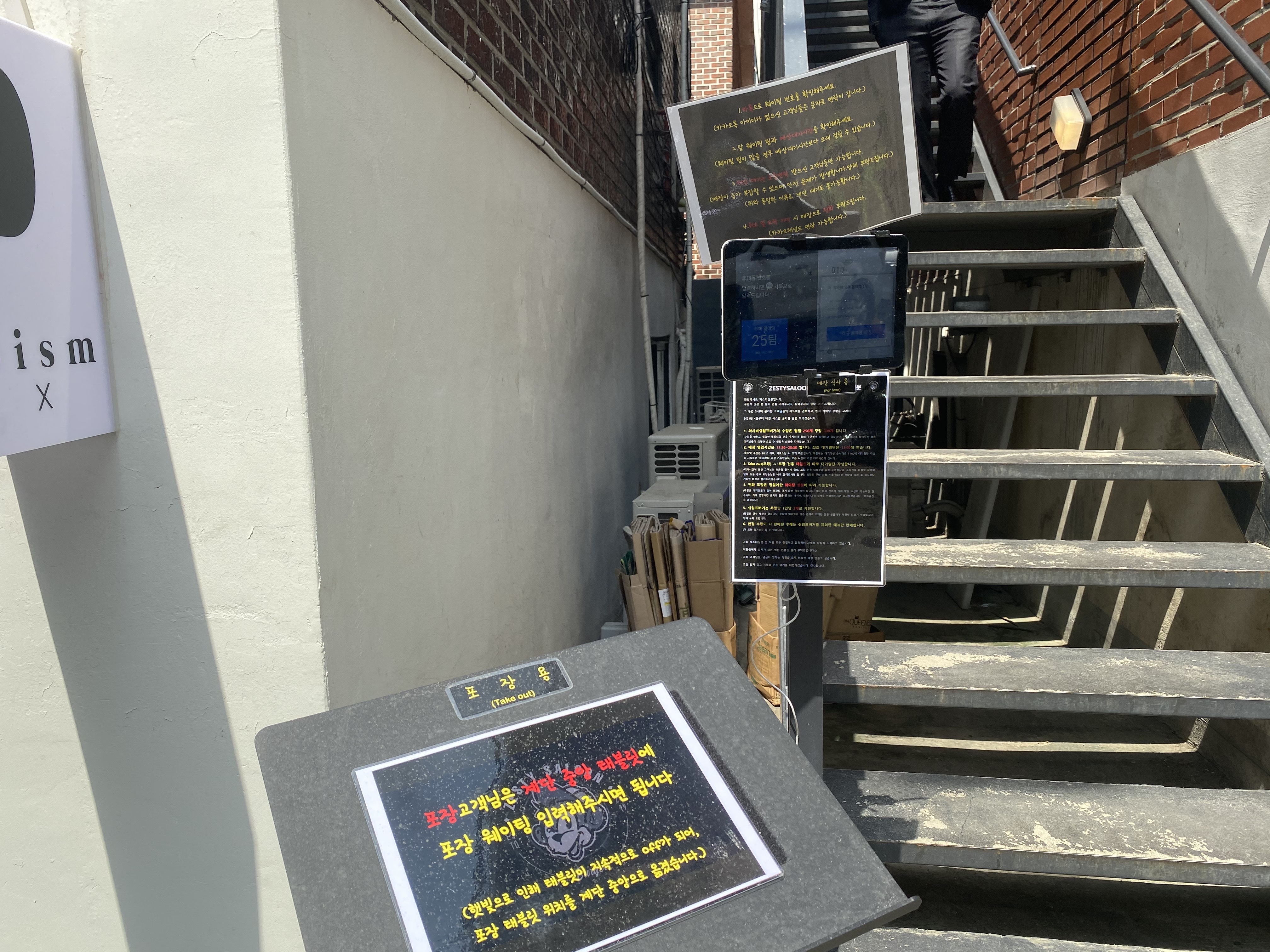 포장은 계단 중앙에 있는 태블릿에 입력하면 됩니다