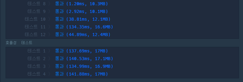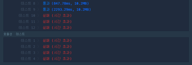 - 시간초과 1) 그냥 풀기 -> 테케 정확도 10,11,12 / 효율성 1,2,3,4 탈