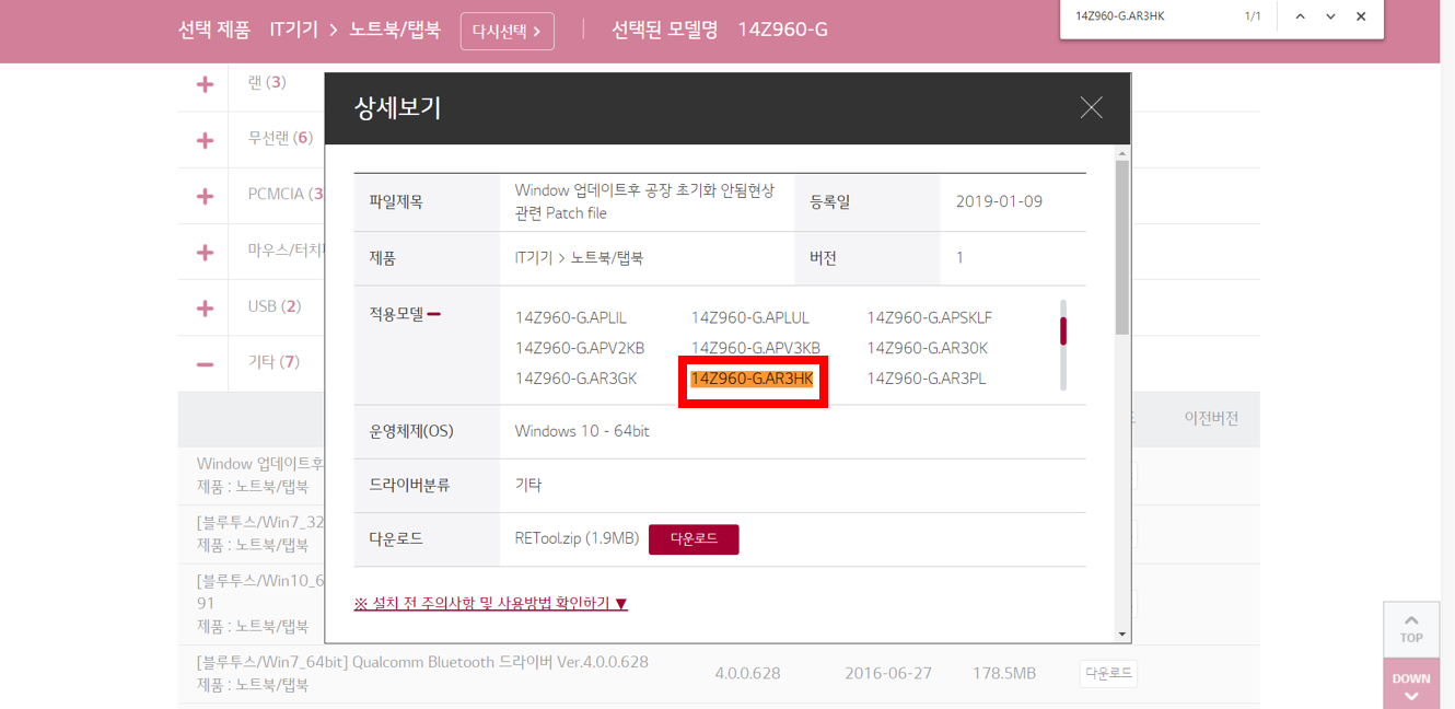 Window 업데이트 후 공장 초기화 안됨 현상 관련 Patch file (2019.01.09)이 있었습니다!